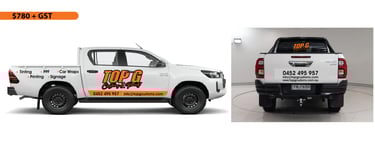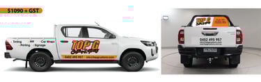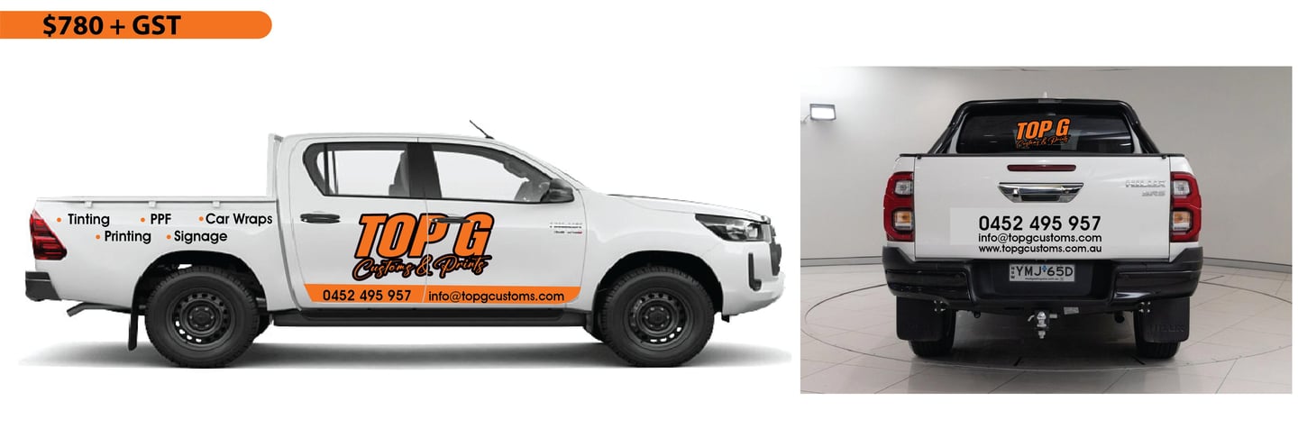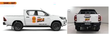 1x big logo for each side + 1x sil wrap with details on 3 sides + services on both sides & One way vision for the rear